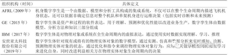 數(shù)字孿生技術(shù)早期被運(yùn)用在國(guó)防軍工及航空航天領(lǐng)域,其基本理念是由 Grieves 教授 2003 年在產(chǎn)品生命周期管理課程上提出。對(duì)數(shù)字孿生技術(shù)概念給出定義,則要追溯到 2009 年美國(guó)空軍研究實(shí)驗(yàn)室(AFRL)提出的飛機(jī)機(jī)身數(shù)字孿生定義。2009—2019 年科研機(jī)構(gòu)對(duì)數(shù)字孿生技術(shù)所給出的定義見表 1。