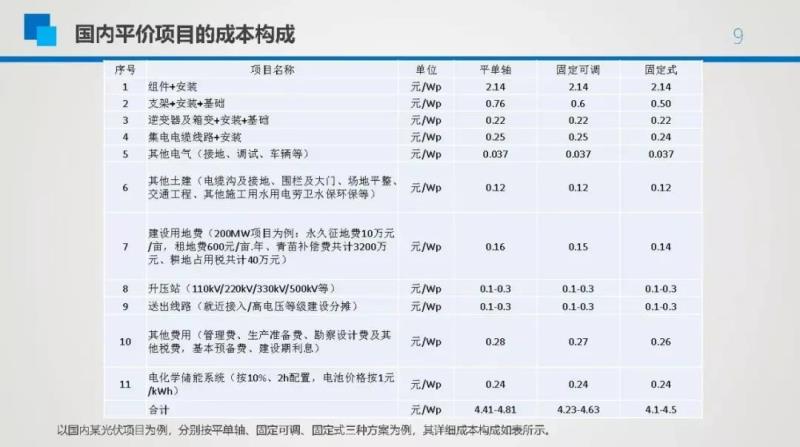 今年以來,隨著組件價格以及大宗商品持續(xù)上漲,導(dǎo)致光伏電站建設(shè)成本水漲船高。此前,在第六屆新能源電站設(shè)計、工程與設(shè)備選型研討會上,西北勘測設(shè)計研究院有限公司新能源工程院總工程師、規(guī)劃研究中心主任惠星測算,在當(dāng)前的價格水平下,國內(nèi)平價光伏項目(含儲能),以固定支架計算其項目成本大致落在4.1~4.5元/瓦左右,即使不含升壓站、儲能、土地建設(shè)等費用,其價格仍將達(dá)到3.3~3.7元/瓦。