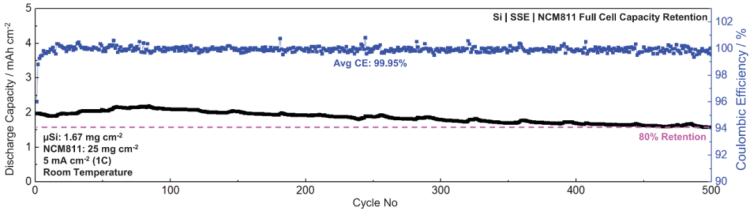 μSi陽極在液態(tài)電解質(zhì)中的壽命很短,但是結(jié)合LiPSCl固態(tài)電解質(zhì)后集成的全固態(tài)電池,在5mA/cm2的電流密度下,經(jīng)過500次充放電循環(huán)后,仍能保持原始80%的容量。這其實(shí)已經(jīng)向前跨了一大步。