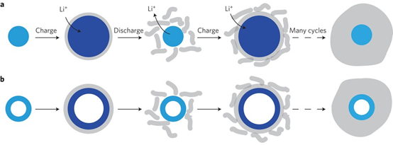 除此之外,如果采用和石墨作為陽極時(shí)一樣的液態(tài)電解質(zhì),在Si陽極與液態(tài)電解質(zhì)的界面處,會(huì)形成一層鈍化層,即固體電解質(zhì)界面膜(SEI膜)。經(jīng)過多次充放電循環(huán)后,Si陽極表面會(huì)形成厚厚的SEI膜,這與理想的薄層SEI膜相比,會(huì)削弱Si陽極的電化學(xué)性能。而且還有一部分Li+被“封存”在了SEI膜中,無法再發(fā)揮傳輸電荷的作用,這在鋰離子電池研究中被稱作“死鋰”。由于這些原因,Si陽極難以實(shí)現(xiàn)商業(yè)化。