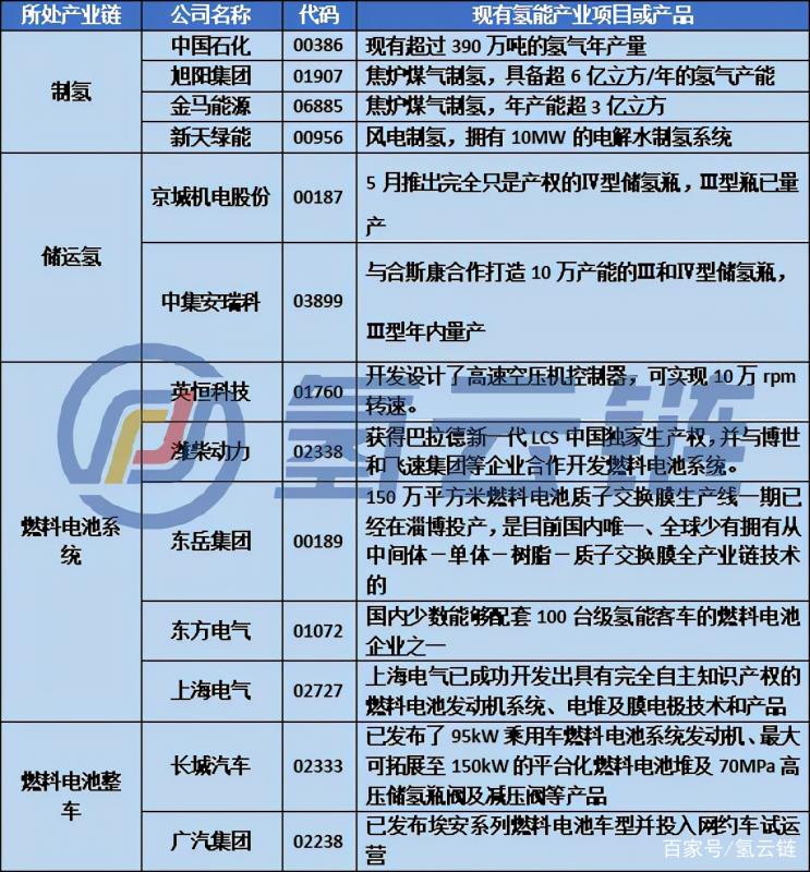 氫云鏈獲悉,億華通此前關(guān)于公司籌劃發(fā)行H股股票并在香港上市相關(guān)事項(xiàng)的提示性公告。目前,在港股上市的涉氫概念股有13家,幾乎涵蓋了整個(gè)氫能產(chǎn)業(yè)鏈,相關(guān)情況如下圖所示。