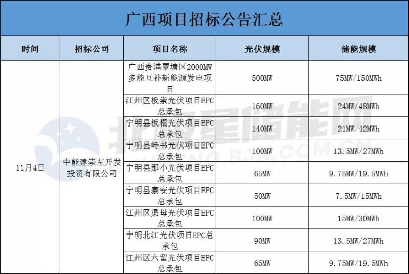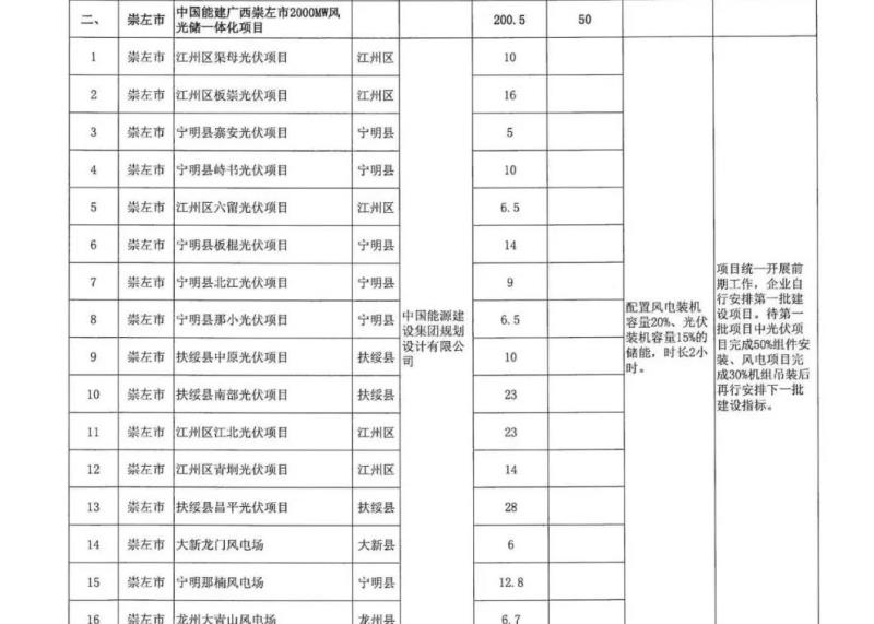 11月4日,中能建崇左開(kāi)發(fā)投資有限公司連續(xù)發(fā)布9個(gè)招標(biāo)項(xiàng)目,儲(chǔ)能配置比例都為15%×2h,共配置儲(chǔ)能規(guī)模達(dá)189MW/378MWh。這9個(gè)項(xiàng)目分別是中國(guó)能建廣西貴港覃塘區(qū)2000MW多能互補(bǔ)新能源發(fā)電項(xiàng)目、江州區(qū)板崇光伏項(xiàng)目EPC總承包、寧明縣板棍光伏項(xiàng)目EPC總承包、寧明縣峙書(shū)光伏項(xiàng)目EPC總承包、寧明縣那小光伏項(xiàng)目EPC總承包、寧明縣寨安光伏項(xiàng)目EPC總承包、江州區(qū)渠母光伏項(xiàng)目EPC總承包、寧明北江光伏項(xiàng)目EPC總承包、江州區(qū)六留光伏項(xiàng)目EPC總承包。并且都位列于之前10月9日,廣西壯族自治區(qū)能源局印發(fā)《2021年市場(chǎng)化并網(wǎng)陸上風(fēng)電、光伏發(fā)電及多能互補(bǔ)一體化項(xiàng)目建設(shè)方案的通知》之中。