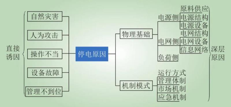 經(jīng)典安全管理理論和模型包括“人機(jī)環(huán)管”理論、事故致因“2-4”模型等,核心思想是將事故致因歸結(jié)為人、機(jī)、環(huán)境和管理的不安全因素,或不安全動(dòng)作和不安全物態(tài)兩方面?;谝陨侠碚?,分析2000年以來(lái)全球發(fā)生的100余起主要大停電事故[11-18],歸納其直接誘因和深層原因,提出停電原因分析體系如圖9所示。
