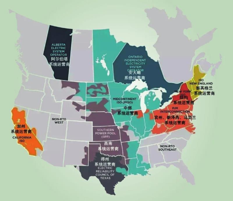 第二級(jí)是電力調(diào)度機(jī)構(gòu),負(fù)責(zé)各自區(qū)域的電力供需平衡,以保持電網(wǎng)穩(wěn)定。北美地區(qū)包括9家系統(tǒng)運(yùn)營(yíng)商(區(qū)域系統(tǒng)運(yùn)營(yíng)商(regional transmission organizations,RTO)、獨(dú)立系統(tǒng)運(yùn)營(yíng)商(independent system organizations,ISO)) [6],如圖3所示,除負(fù)責(zé)各自轄區(qū)內(nèi)的電網(wǎng)調(diào)度和電力實(shí)時(shí)平衡外,還負(fù)責(zé)該區(qū)域內(nèi)的市場(chǎng)運(yùn)營(yíng)。