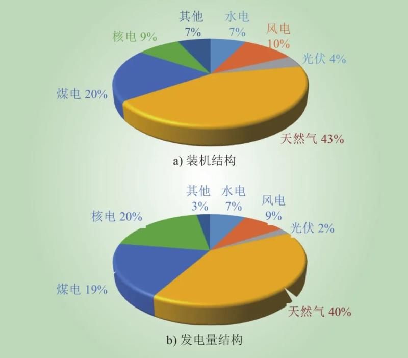 自2000年以來(lái),隨著美國(guó)“頁(yè)巖氣革命”的成功,美國(guó)電網(wǎng)的電源結(jié)構(gòu)逐漸從以燃煤發(fā)電為主向以天然氣發(fā)電為主過(guò)渡。截至2020年年底,美國(guó)天然氣發(fā)電裝機(jī)容量達(dá)到4.8億kW。2020年天然氣發(fā)電量達(dá)到1.6萬(wàn)億kW·h。2020年美國(guó)電源裝機(jī)和發(fā)電量結(jié)構(gòu)[1]如圖1所示。