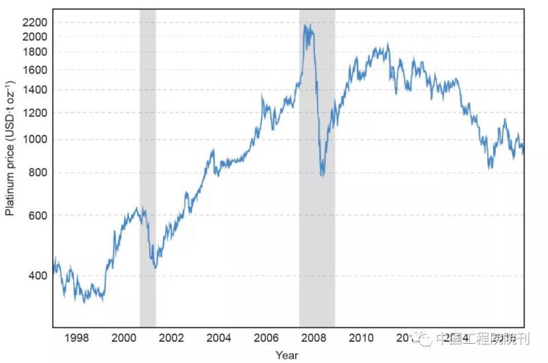 圖5 1996年來鉑的歷史價格(USD·t oz–1)。2017年6月22日,鉑的價格為923.95 USD·t oz–1