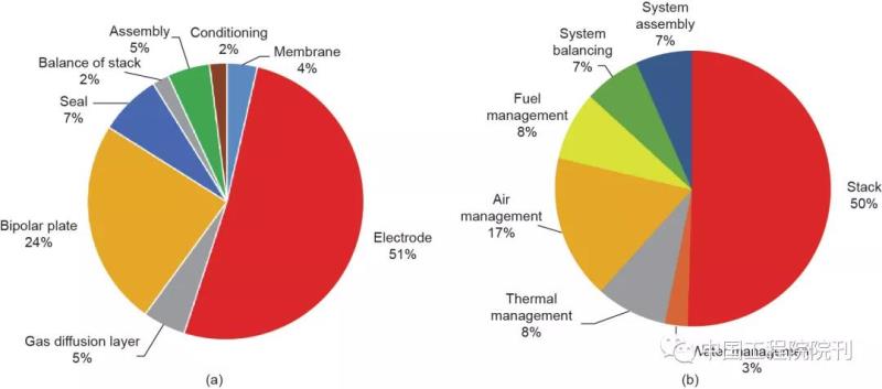 制造成本包括設(shè)計、材料、元件制造和裝配、工人勞動、設(shè)備資產(chǎn),這些要素貫穿整個燃料電池的定制以及商業(yè)生產(chǎn)過程。Ahluwalia等在阿貢(Argonne)實驗室計了80 kWnet質(zhì)子交換膜(PEM)燃料電池的配置體系(圖3)。Yang分析了這種80 kWnet阿貢(Argonne)燃料電池組體系的成本,并準確計算出該電池組的總成本為大約30 USD·kW?1。電池的電極(包括陰極和陽極)和催化劑占總成本的51%。電池組的裝配和調(diào)試大約占總成本的7%。因此,燃料電池組中成本最高的3個部分是電極、雙極板和電池密封圈[圖4(a)]。
