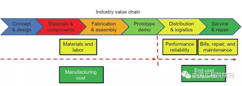 一項新的產(chǎn)品要先在實驗過程中達到經(jīng)濟和技術(shù)上的目標,然后再根據(jù)合理設(shè)計的指標,在完善的體系內(nèi)進行大規(guī)模生產(chǎn)。制造過程的生命周期和價值鏈代表了產(chǎn)品的生產(chǎn)過程和成本,如圖2所示。燃料電池組的技術(shù)經(jīng)濟生命周期可分為兩個主要的階段:制造階段和最終用戶階段。