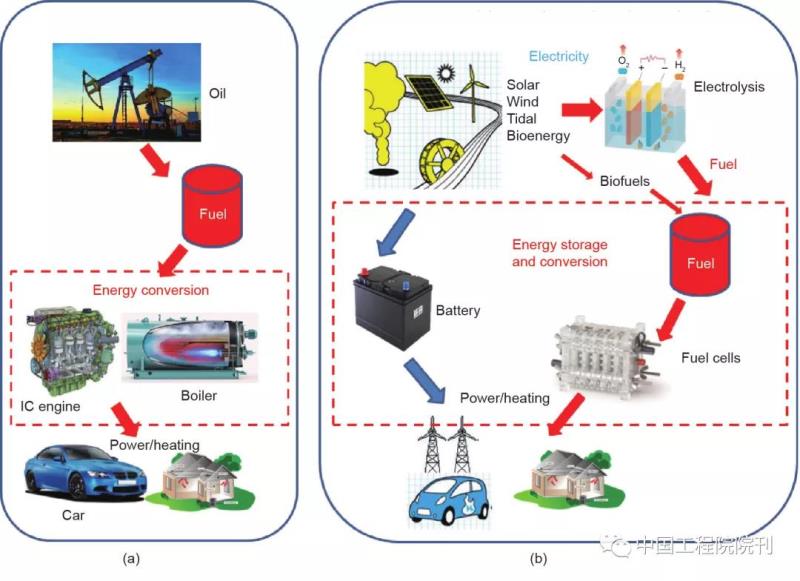 圖1 能源經(jīng)濟。(a)化石燃料能源經(jīng)濟;(b)可再生能源經(jīng)濟