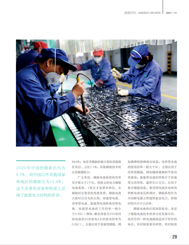 廣義來說,儲能電池系統(tǒng)的功率至少要大于1千瓦,而狹義的電力儲能電池系統(tǒng),1兆瓦才是基本單位。從儲能時長要求的角度來看,儲能電池大致可以分為四大類:容量型電池、功率型電池、能量型電池和備用型電池。容量型電池的工作倍率一般小于0.25C(例如,額定容量為100安時的電池用25安放電4小時放電倍率為0.25C),主要應(yīng)用于容量型儲能,例如調(diào)峰和削峰填谷場景;功率型電池的使用倍率一般大于2C,主要應(yīng)用于功率型儲能,例如輔助調(diào)頻和平滑功率波動;能量型電池倍率則介于容量型與功率型,通常為1C左右,應(yīng)用于復(fù)合儲能場景;備用型電池在電網(wǎng)突然斷電或電壓跌落時,儲能系統(tǒng)作為不間斷電源立即提供緊急電力,持續(xù)時間不少于15分鐘。