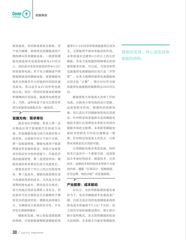 在風力、光伏等新能源快速發(fā)展的當下,電化學(xué)儲能技術(shù)發(fā)展前景廣闊。目前主流應(yīng)用的電池儲能系統(tǒng)的度電成本普遍高于0.5元/千瓦時,加之國內(nèi)市場機制建設(shè)滯后,絕大部分缺少盈利模式,業(yè)主投資儲能的收益無法保障,企業(yè)缺乏自愿安裝儲能的積極性,因此影響了儲能的規(guī)模化商業(yè)應(yīng)用。未來儲能度電成本還有較大下降空間,在電力市場改革和建設(shè)過程中,“新能源+儲能”的模式也可以通過多種手段參與電力市場獲益。
