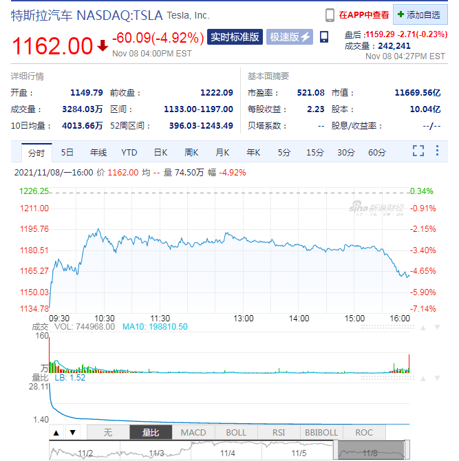 周一,美股盤前,特斯拉股價一度大跌逾7%。截至周二收盤,特斯拉報1162美元/股,跌幅達4.84%,最新市值1.16萬億美元。