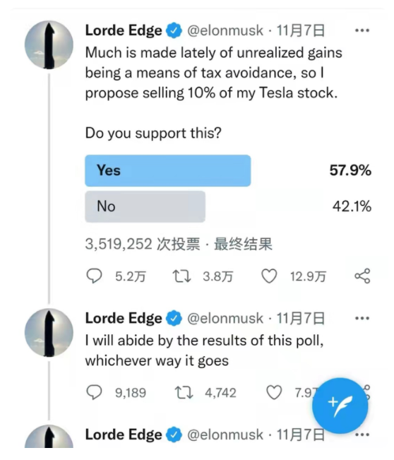 11月7日,馬斯克在社交媒體上又發(fā)起了一項民意調(diào)查,詢問其6250萬粉絲他是否應(yīng)該出售10%(價值210億美元,約合1300億人民幣)的特斯拉股票。