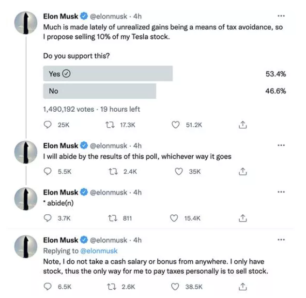 馬斯克表示,“最近有很多人認(rèn)為未實現(xiàn)收益是一種避稅手段,所以我建議出售10%的特斯拉股票。你們是否支持這項提議?”