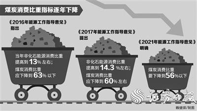 事實上,國家能源局已連續(xù)多年在年度能源工作指導(dǎo)意見中明確推動能源消費結(jié)構(gòu)優(yōu)化。例如,《2016年能源工作指導(dǎo)意見》指出,當(dāng)年非化石能源消費比重提高到13%左右;煤炭消費比重應(yīng)下降到63%以下。隨后,非化石能源消費比重這一指標(biāo)逐年提高,煤炭消費比重在歷年發(fā)布的能源工作指導(dǎo)意見中不斷下降?!?017年能源工作指導(dǎo)意見》提出,非化石能源消費比重提高到14.3%左右;煤炭消費比重應(yīng)下降到60%左右。而今年發(fā)布的《2021年能源工作指導(dǎo)意見》明確,煤炭消費比重要下降到56%以下。