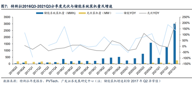 而統(tǒng)計數(shù)據(jù)一定程度上也佐證了這一發(fā)展方向。2015-2020年,特斯拉發(fā)電儲能業(yè)務收入復合增速達82.09%。今年Q1-Q3,特斯拉儲能裝機規(guī)模達4.73GWh,同比增長230.64%;光伏裝機量達437MW,同比增長267.23%,其中,Q3兩項裝機規(guī)模均創(chuàng)單季度新高。