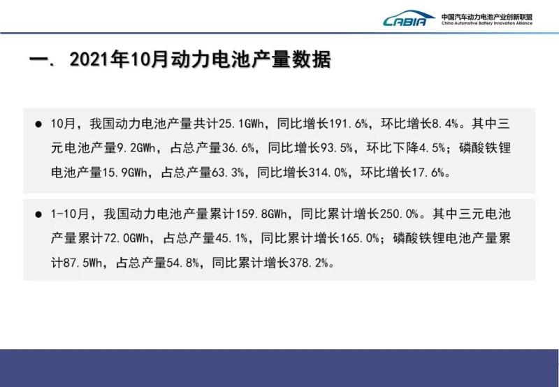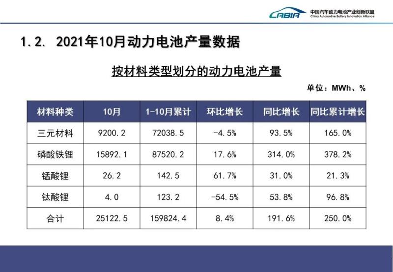 產(chǎn)量方面,2021年10月,我國動力電池產(chǎn)量共計25.1GWh,同比增長191.6%,環(huán)比增長8.4%。其中三元電池產(chǎn)量9.2GWh,占總產(chǎn)量36.6%,同比增長93.5%,環(huán)比下降4.5%;磷酸鐵鋰電池產(chǎn)量15.9GWh,占總產(chǎn)量63.3%,同比增長314.0%,環(huán)比增長17.6%。1-10月,我國動力電池產(chǎn)量累計159.8GWh,同比累計增長250.0%。其中三元電池產(chǎn)量累計72.0GWh,占總產(chǎn)量45.1%,同比累計增長165.0%;磷酸鐵鋰電池產(chǎn)量累計87.5Wh,占總產(chǎn)量54.8%,同比累計增長378.2%。
