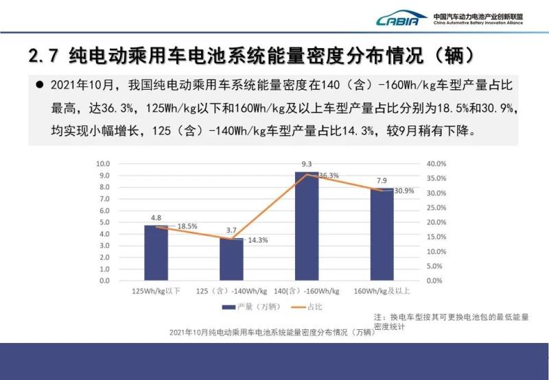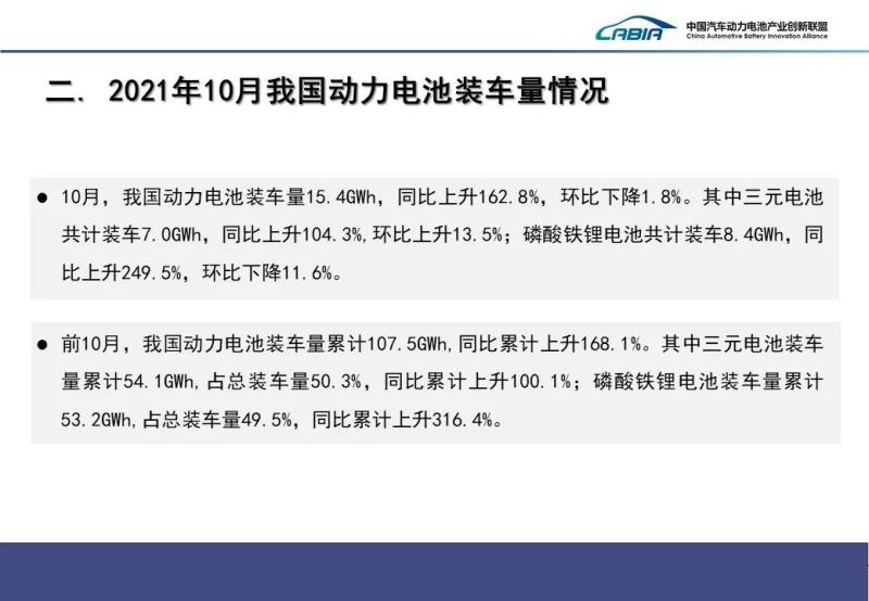 裝車量方面,2021年10月,我國動力電池裝車量15.4GWh,同比上升162.8%,環(huán)比下降1.8%。其中三元電池共計裝車7.0GWh,同比上升104.3%,環(huán)比上升13.5%;磷酸鐵鋰電池共計裝車8.4GWh,同比上升249.5%,環(huán)比下降11.6%。1-10月,我國動力電池裝車量累計107.5GWh,同比累計上升168.1%。其中三元電池裝車量累計54.1GWh,占總裝車量50.3%,同比累計上升100.1%;磷酸鐵鋰電池裝車量累計53.2GWh,占總裝車量49.5%,同比累計上升316.4%。
