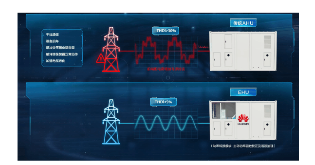 因此,降低制冷設(shè)備所產(chǎn)生的諧波成為行業(yè)趨勢,華為新一代間接蒸發(fā)冷卻解決方案(EHU)進(jìn)行了深度的冷電融合,增加功率轉(zhuǎn)換模塊,能有效將制冷設(shè)備的諧波從30%以上降低到5%以下,直接從源頭處解決諧波難題。