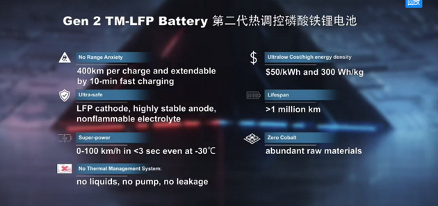第三它可以讓我們使用非燃電解液,這樣讓磷酸鐵鋰電池的安全性都更上一層樓,在繼續(xù)的研究中,我們又研發(fā)出第二代熱調(diào)控磷酸鐵鋰電池,目前在實驗室我們已經(jīng)做到300瓦時每公斤的能量密度并成本有望降至每瓦時3毛5。新成果再加上第一代的其他優(yōu)勢,例如10分鐘快充,不怕冷,還有不含鈷,鈷是戰(zhàn)略性金屬,沒有熱管理系統(tǒng),這應(yīng)該是一款幾乎接近終極的電池,可滿足絕大部分的應(yīng)用需求。