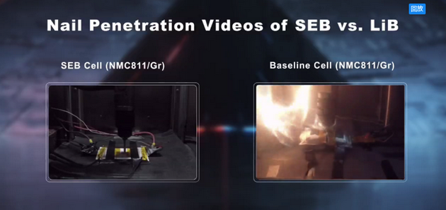 確實我們把這種鈍化過的電池進行最嚴(yán)苛的針刺實驗,即使是采用最大的能量密度的電芯,290瓦時每公斤而且用最不穩(wěn)定的三元811材料,針刺的最高溫度也不超過55度,這比磷酸鐵鋰電池針刺溫度60度還要低,也就是說我們可以把極高能量密度的三元電池,做的比普通的磷酸鐵鋰電池還安全。