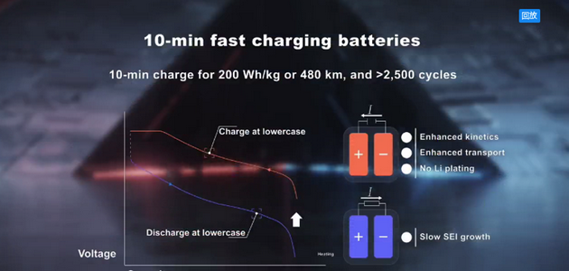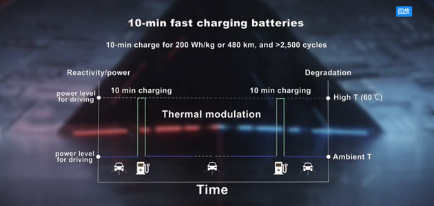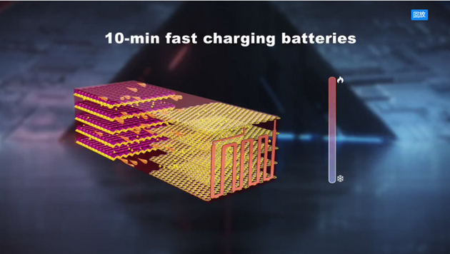 熱調(diào)控原理讓我們也發(fā)明了10分鐘快充電池,因為快充的科學(xué)要求是電池的活性足夠高,鋰離子在兩電極之間傳遞的足夠快,而我們熱調(diào)控機理可以讓電池做到這些,所以未來當(dāng)電動汽車來到快充樁之前,我們可以給電池來一個30秒的熱刺激,然后再在10分鐘之內(nèi)把大電流充到電池當(dāng)中。