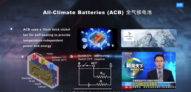 針對前面講到的低溫痛點,我們發(fā)明了全氣候電池,這是在不改變電池材料危險性的基礎(chǔ)下,也就是說不增加電解液的可燃性,也不改變電極材料的熱穩(wěn)定性,而是在電池的內(nèi)部植入一片10微米厚度的鎳箔作為發(fā)熱體,這個厚度只有人的頭發(fā)絲的1/10,所以幾乎不增加電池的體積和重量。