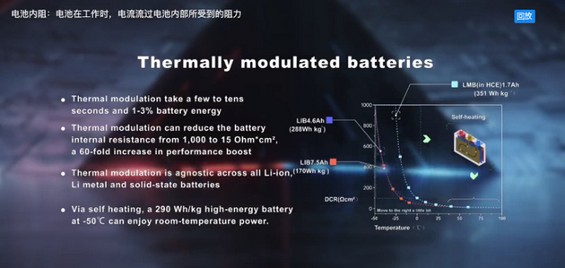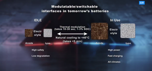 在過去10多年中,我的團隊一直在尋找和探索這種可調(diào)控界面的電池,確實我們找到了一種熱調(diào)控的方法,利用瞬間熱刺激,大概需要10~30秒鐘消耗1%~3%的電量,我們就可以把電化學(xué)界面調(diào)大調(diào)強。有了這個快捷低能耗的熱刺激方法,我們就可以用最穩(wěn)定最安全的材料制作電池,在不使用的時候電池內(nèi)的化學(xué)界面當(dāng)然是保持最低的水平,保障了電池的絕對安全和最低的老化速率。而工作的時候,用熱刺激可以把電池里的反應(yīng)界面瞬間調(diào)大調(diào)強來提供高功率快充能力,甚至是在任何低溫環(huán)境中都有非常良好的性能,等到電池工作完了,自然冷卻可以在5分鐘內(nèi)把電池溫度降到40度以下,這樣電池回到它的原始狀況,是安全的穩(wěn)定的或者說是低調(diào)的。
