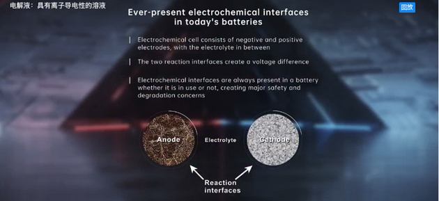 在回答這個基本的科學(xué)問題之前,讓我們先來看一下這200多年以來一成不變的電池結(jié)構(gòu)。它有三種材料組成:負(fù)極材料正極材料兩者之間有電解液隔開,這種結(jié)構(gòu)自然地形成了兩種界面。一存在于正極材料和電解液之間;二是在負(fù)極材料和電解液之間,而這兩種界面之間存在著電勢差也就給出了電池的電壓。對鋰離子電池來講這個電壓大約在4伏左右,顯然電池內(nèi)的反應(yīng)界面是永遠(yuǎn)存在的而且一直在工作著,無論我們使用還是不使用電池,比如說我們把電動汽車停在車庫里關(guān)掉汽車,這個時候不用電池,但是我們?nèi)匀豢梢詼y量到電池的最大電壓,這就說明電池里的反應(yīng)界面仍然存在而且活躍地工作,而這個永遠(yuǎn)存在的反應(yīng)界面剛好是電池的安全隱患和衰老的最根本原因。