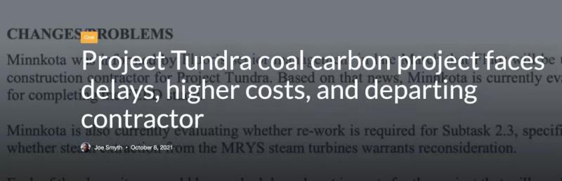 全球工程和建筑公司福陸公司(Fluor Corporation)正與明科塔電力合作社合作進行前端工程和設(shè)計(FEED)研究,該研究主要由能源部資助。明科塔電力合作社在過去兩年向美國能源部(DOE)提交的季度報告顯示,Project Tundra成本高于預(yù)期,已經(jīng)錯過了最后開工的期限,主要承包商表示不會建造該項目。導(dǎo)致成本估算提高的原因包括修建16英里天然氣管道和為碳捕獲設(shè)施提供蒸汽的燃氣鍋爐的成本增加。