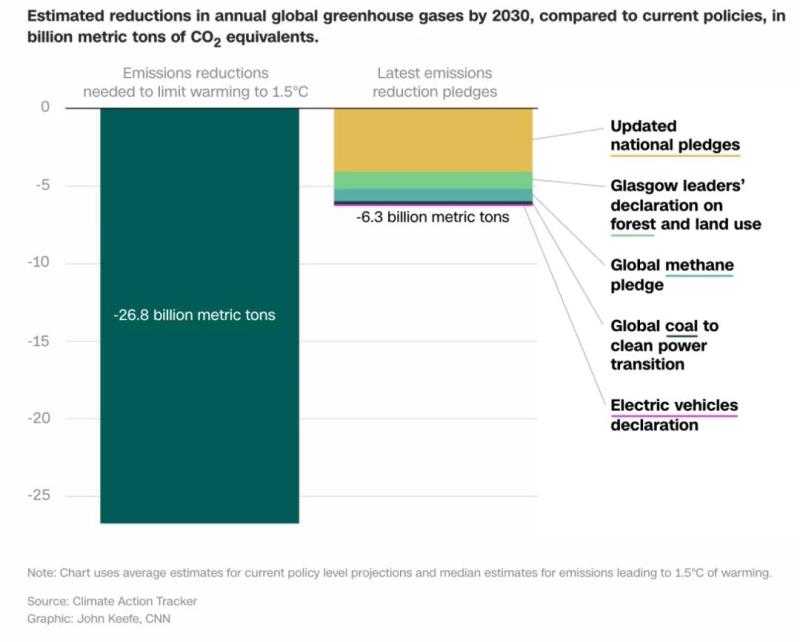 聯(lián)合國(guó)秘書長(zhǎng)安東尼奧·古特雷斯說(shuō),格拉斯哥協(xié)議“反映了當(dāng)今世界的利益、條件、矛盾和政治意愿...不幸的是,集體政治意愿不足以克服一些深刻的矛盾?!备鶕?jù)氣候行動(dòng)追蹤機(jī)構(gòu)的預(yù)測(cè),為了到2030年將全球變暖限制在1.5攝氏度,世界需要將溫室氣體排放率每年減少近270億公噸。但目前的承諾,包括在COP26會(huì)議上做出的承諾,只達(dá)到所需減排量的四分之一。