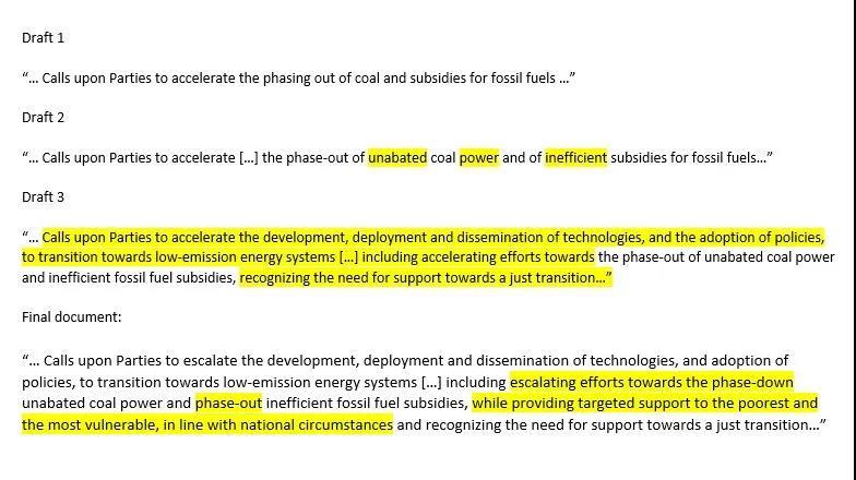 但是,格拉斯哥協(xié)議關(guān)于煤電的措辭在一周內(nèi)被多次淡化。在閉幕式全體會(huì)議前一小時(shí),部長(zhǎng)們?cè)谧詈笠环昼姲l(fā)生了激烈的爭(zhēng)論,由印度和中國(guó)共同提出的最終修改是對(duì)協(xié)議文本的唯一修改,得到了南非、玻利維亞和伊朗的支持。各國(guó)最終同意“逐步減少”(phase down)而不是“逐步淘汰”(phase out)沒(méi)有減排措施的煤電,并逐步取消低效的化石燃料補(bǔ)貼。