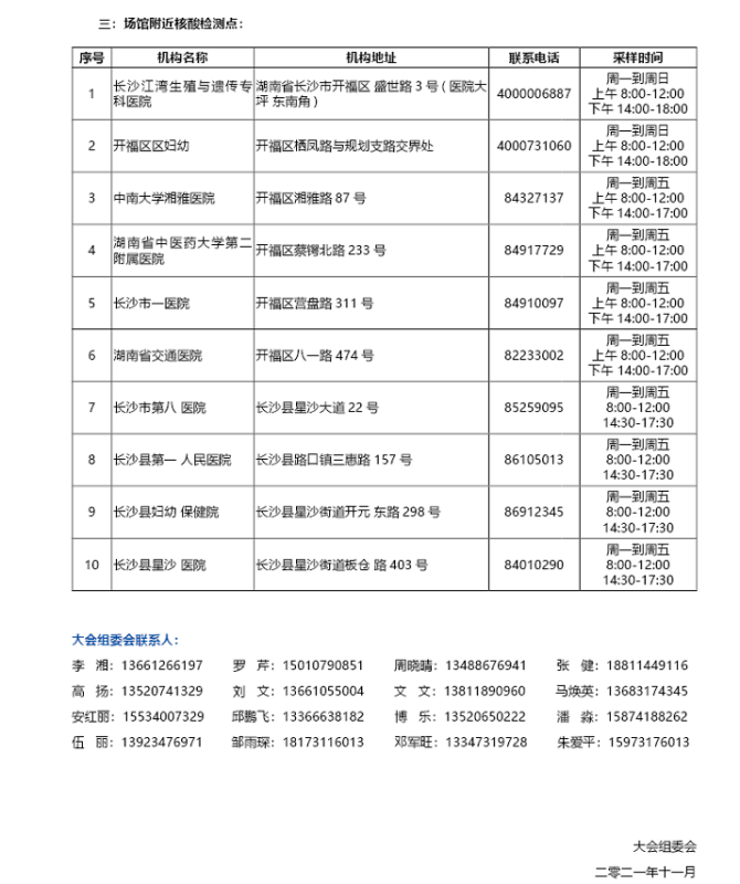 4、11月30-12月2日早上9:00--下午4:30,組委會在湖南國際會展中心(芒果館)南廣場防疫大棚設有核酸檢測點,53元/人,費用自理。