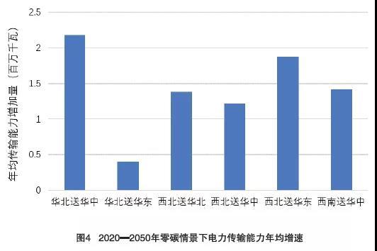 我國(guó)可再生能源資源集中分布在內(nèi)蒙古、西北、西南等地區(qū),而電力負(fù)荷的中心主要集中在華中和華東等地區(qū)。為了滿足電力供給和需求的平衡,大規(guī)??稍偕茉吹拈_(kāi)發(fā)利用,必須相應(yīng)增加跨區(qū)域的電網(wǎng)傳輸能力。情景分析結(jié)果顯示,在零碳情景下,電力傳輸設(shè)施的加速建設(shè)對(duì)全國(guó)范圍電力系統(tǒng)的優(yōu)化配置有更強(qiáng)的支撐作用,尤其是在可再生能源資源豐富的華北電網(wǎng)、西北電網(wǎng)和西南電網(wǎng),其向負(fù)荷中心區(qū)的華東和華中電網(wǎng)輸送量都在全國(guó)前列,電網(wǎng)傳輸能力的年均增速也全國(guó)領(lǐng)先(圖4)。這也支撐了在零碳情景下,未來(lái)我國(guó)實(shí)現(xiàn)高比例可再生能源發(fā)電并網(wǎng)的可能。