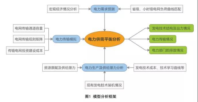 根據(jù)電力行業(yè)特點(diǎn),模型的分析框架包含電力需求模塊、電力生產(chǎn)模塊以及電力傳輸模塊三大部分(圖1)。電力需求模塊根據(jù)人口、產(chǎn)業(yè)、技術(shù)、城鎮(zhèn)化水平等宏觀經(jīng)濟(jì)分析數(shù)據(jù),結(jié)合省級(jí)電網(wǎng)負(fù)荷曲線展望未來(lái)省級(jí)區(qū)域分部門(mén)的用電需求結(jié)構(gòu)及趨勢(shì)。電力生產(chǎn)是模型分析的核心,以小時(shí)級(jí)的時(shí)間尺度為分析基礎(chǔ),詳細(xì)描述32個(gè)省級(jí)區(qū)域的18種發(fā)電技術(shù)組合,分析各省級(jí)區(qū)域的發(fā)電技術(shù)裝機(jī)結(jié)構(gòu)及發(fā)展趨勢(shì),各發(fā)電技術(shù)的出力及發(fā)電順序等。電力傳輸模塊主要關(guān)注未來(lái)區(qū)域間電力傳輸通道的投資建設(shè)成本,以及省級(jí)和大電網(wǎng)區(qū)域間的電力傳輸規(guī)則、傳輸通道容量等。核心分析在于省級(jí)區(qū)域電網(wǎng)傳輸規(guī)則矩陣構(gòu)建,輸出電力傳輸約束條件。