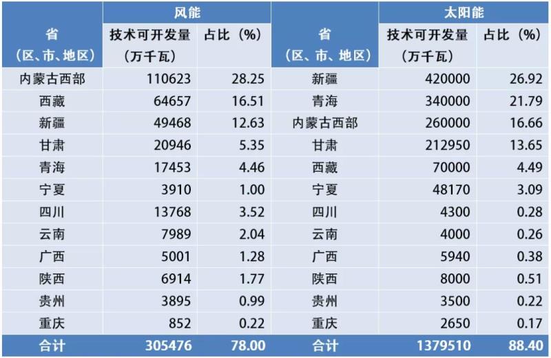 表2 西部地區(qū)12個?。▍^(qū)、市、地區(qū))風(fēng)能、太陽能資源技術(shù)可開發(fā)量及占比情況
