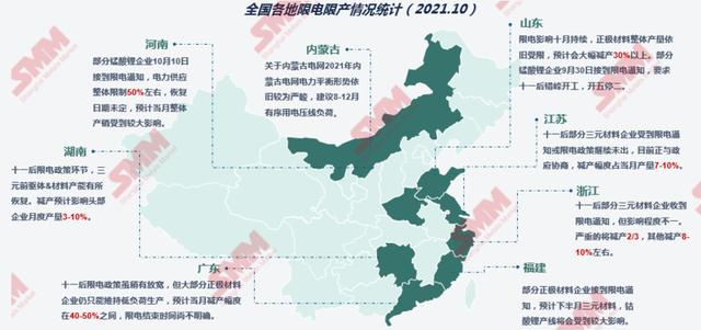 此外,今年下半年以來,全國(guó)多地下發(fā)能耗雙控文件,一些耗能大、污染大的行業(yè)紛紛停產(chǎn)停工,其中鋰電行業(yè)各材料生產(chǎn)也均受到限產(chǎn)影響。