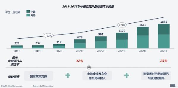 2021年,全球新能源汽車預(yù)計(jì)總銷量為680萬輛,同比增長(zhǎng)近115%,其中,中國(guó)預(yù)計(jì)全年銷量為300萬輛,滲透率將達(dá)12%。到2025年,機(jī)構(gòu)預(yù)計(jì)國(guó)內(nèi)新能源汽車滲透率有望提升至25%。