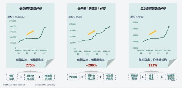 近日,在由上海期貨交易所和上海有色金屬網(wǎng)(SMM)共同舉辦的2021年有色金屬行業(yè)年會(huì)上,鋰電產(chǎn)業(yè)鏈企業(yè)人士齊聚,探討漲價(jià)潮下的應(yīng)對(duì)方式和行業(yè)未來發(fā)展方向。SMM新能源研究咨詢總監(jiān)易彥婷對(duì)記者表示,受新能源車滲透率提升、電池需求拉動(dòng),鋰電各材料的需求量、價(jià)格均大幅增長(zhǎng)。2021年初至今,鋰電池各大主材大幅漲價(jià),碳酸鋰價(jià)格上漲約275%,正負(fù)極、隔膜、電解液價(jià)格上漲普遍為50~500%。隨著新能源行業(yè)由粗放增長(zhǎng)逐步邁入供需平衡的階段,如何定價(jià)、穩(wěn)定供應(yīng)鏈成為全產(chǎn)業(yè)鏈的焦點(diǎn)。