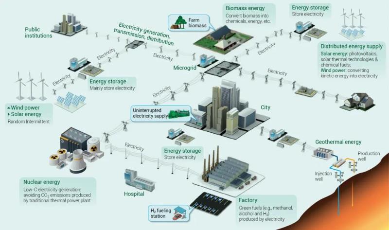 對(duì)標(biāo)碳中和,實(shí)現(xiàn)一次能源有序減量替代,需大力發(fā)展可再生能源??稍偕茉词且粋€(gè)完整的技術(shù)體系,不僅需要太陽(yáng)能、風(fēng)能、地?zé)崮?、海洋能等,更需要?chǔ)能技術(shù)的配合,形成真正的新能源體系。核能與氫能具有清潔低碳、綠色環(huán)保等優(yōu)點(diǎn),是實(shí)現(xiàn)碳中和目標(biāo)的重要技術(shù);生物質(zhì)能也是實(shí)現(xiàn)能源結(jié)構(gòu)調(diào)整的重要支撐。本文總結(jié)了可再生能源大規(guī)模應(yīng)用中的關(guān)鍵核心技術(shù),以及這些關(guān)鍵核心技術(shù)對(duì)實(shí)現(xiàn)碳中和目標(biāo)的影響,同時(shí)對(duì)這些技術(shù)未來的發(fā)展進(jìn)行了展望(圖2)。