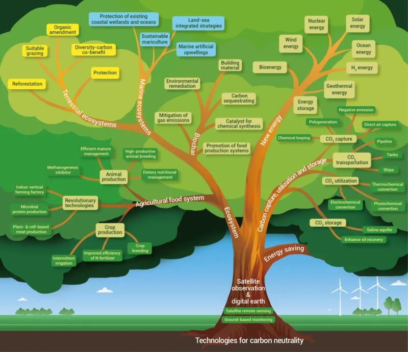 世界正朝著碳中和邁進(jìn),未來需構(gòu)建以清潔能源為主體的新型電力系統(tǒng),實(shí)現(xiàn)一次能源有序減量替代和可再生能源的大規(guī)模應(yīng)用;統(tǒng)籌生態(tài)系統(tǒng)保護(hù)和固碳功能,推進(jìn)基于土地利用與食物生產(chǎn)變革,提高陸海一體生態(tài)碳匯;優(yōu)化生物炭生產(chǎn)和生命周期過程,制定標(biāo)準(zhǔn)推進(jìn)低碳產(chǎn)業(yè)發(fā)展;利用多聯(lián)產(chǎn)技術(shù)、化學(xué)鏈燃燒技術(shù)、化石燃料與可再生能源互補(bǔ)技術(shù),解決CCUS技術(shù)推廣高能耗高成本障礙;發(fā)展新型衛(wèi)星,全面監(jiān)測(cè)溫室氣體排放和陸海碳匯,星地協(xié)同增強(qiáng)碳收支核算能力。全球須通力合作、技術(shù)共享,以早日實(shí)現(xiàn)碳中和與可持續(xù)發(fā)展。