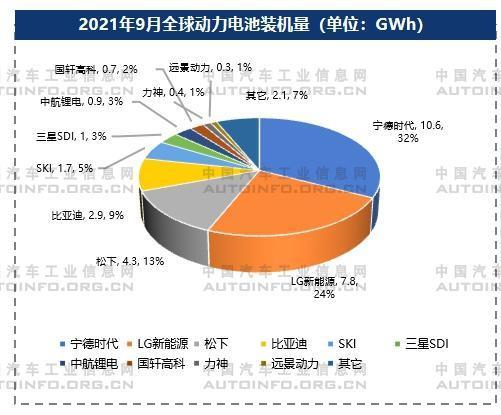 SNE Research發(fā)布的數(shù)據(jù)顯示,2021年9月,全球電動(dòng)車(chē)電池裝機(jī)量約為32.9 GWh,同比增長(zhǎng)近一倍(94%)。在9月全球動(dòng)力電池裝機(jī)量Top 10榜單中,中國(guó)有六家電池制造商上榜,分別是寧德時(shí)代、比亞迪、中航鋰電、國(guó)軒高科、力神和遠(yuǎn)景動(dòng)力,占總市場(chǎng)份額的48%。其中,寧德時(shí)代仍居榜首,力神擠掉了蜂巢能源,位列第9。