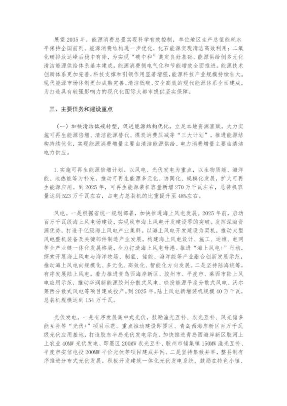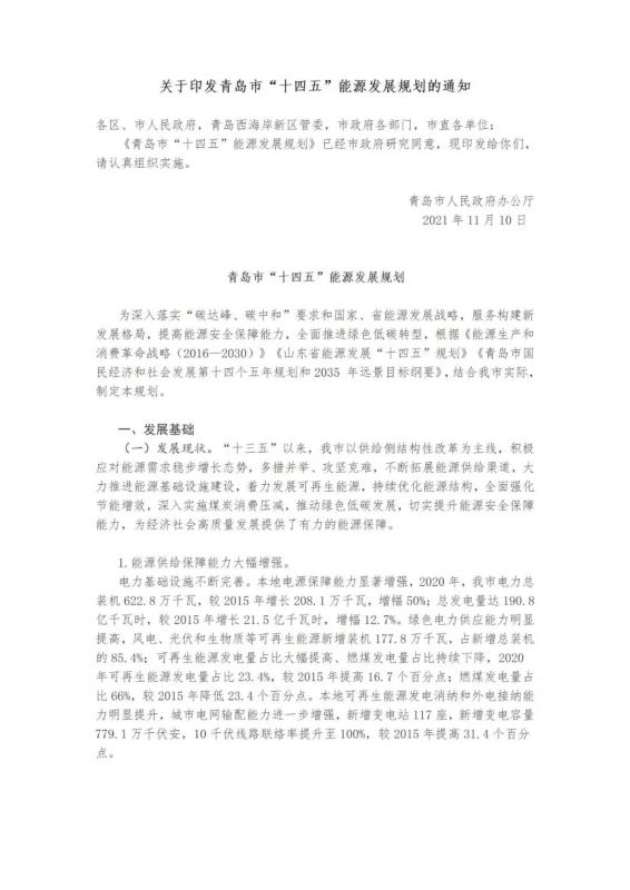 中國儲能網(wǎng)訊:近日,山東青島市人民政府辦公廳印發(fā)了《關于印發(fā)青島市“十四五”能源發(fā)展規(guī)劃的通知》。提出了青島市“十四五”能源發(fā)展的主要任務和建設重點。實施可再生能源倍增計劃。以風電、光伏發(fā)電為重點,以生物質能、海洋能、地熱能等為補充。到2025年,可再生能源裝機容量新增270萬千瓦左右,總裝機容量達到523萬千瓦左右,占電力總裝機的比重提升至48%左右。