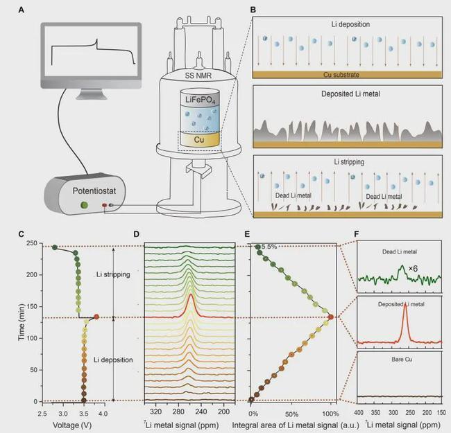 針對這一問題,楊勇教授課題組利用自建的電化學原位固體核磁共振裝置,原位觀察鋰金屬的動態(tài)沉積/溶解過程,并通過定量的7Li核磁共振譜學技術量化循環(huán)過程形成的各種非活性鋰,探討了NMR定量技術、滴定氣相色譜技術 (TGC) 以及質(zhì)譜滴定技術(MST)在分析“死鋰”組份產(chǎn)生差異的原因來自氫化鋰(LiH)。通過更為可靠的NMR定量方法,研究了鋰金屬電池在典型的電流密度、電解液添加劑和鋰鹽濃度條件下的失效機制。通過這些定量,揭示了鋰金屬電池的兩階段失效過程,并提出了抑制非活性鋰形成的策略。