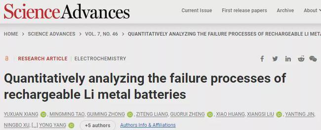 中國儲能網(wǎng)訊:近日,廈門大學化學化工學院楊勇教授課題組在鋰金屬電池失效機制的定量研究上取得重要進展,成果以“Quantitatively analyzing the failure processes of rechargeable Li metal batteries”為題,在線發(fā)表于《科學進展》(Science Advances doi:10.1126/sciadv.abj3423)。