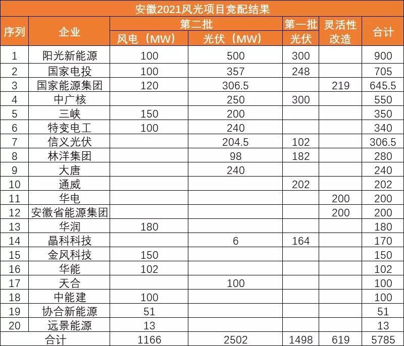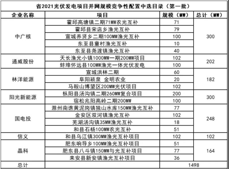 此前10月21日,安徽省能源局下發(fā)《2021年光伏發(fā)電項(xiàng)目并網(wǎng)規(guī)模競(jìng)爭(zhēng)性配置(第一批次)中選公告》,規(guī)模共計(jì)1498MW。中廣核、陽光新能源、國家電投、通威、林洋、晶科、信義光能等7家企業(yè)中標(biāo)20個(gè)光伏第一批優(yōu)選項(xiàng)目。加上此次安徽省總共公示了4GW光伏、1.166GW風(fēng)電項(xiàng)目。
