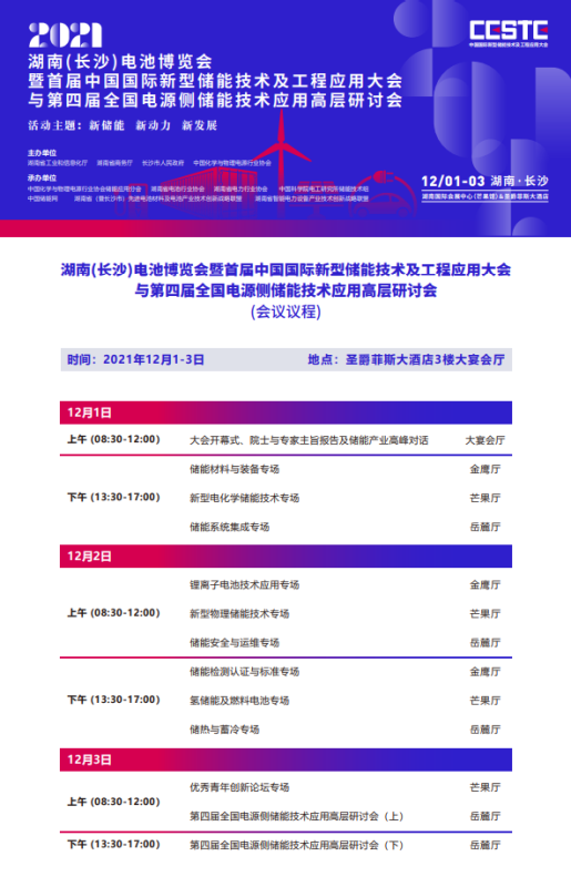 本次大會將設(shè)置2021年(長沙)先進(jìn)儲能材料產(chǎn)業(yè)集群發(fā)展論壇暨儲能產(chǎn)業(yè)高峰對話、鋰離子電池技術(shù)、新型電化學(xué)儲能技術(shù)、新型物理儲能技術(shù)、儲能材料與裝備、儲能電站安全與運(yùn)維、儲能檢測、認(rèn)證與標(biāo)準(zhǔn)、儲能系統(tǒng)集成、儲熱與蓄冷、氫儲能及燃料電池、優(yōu)秀青年創(chuàng)新論壇以及第四屆全國電源側(cè)儲能技術(shù)及應(yīng)用高層研討會等十三個(gè)專場活動(dòng),會議同期還將安排相關(guān)儲能電站項(xiàng)目參觀交流活動(dòng)。