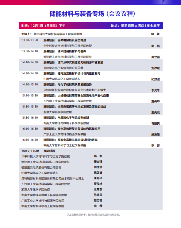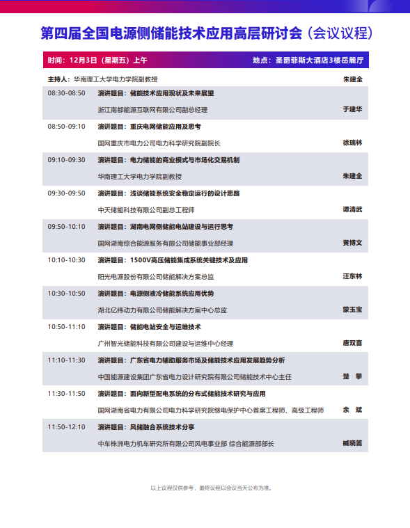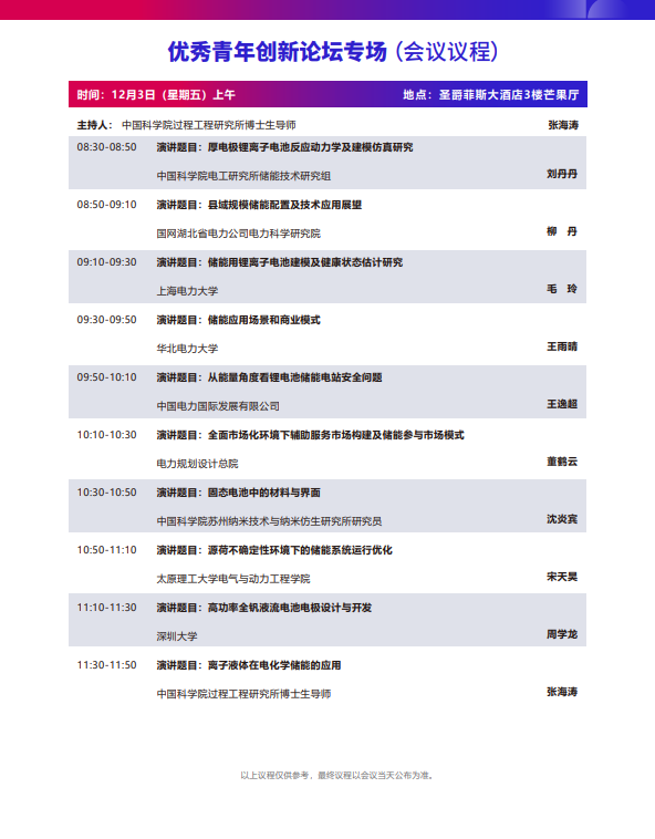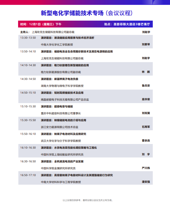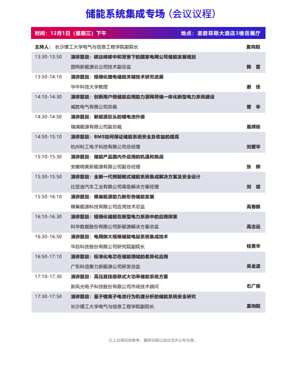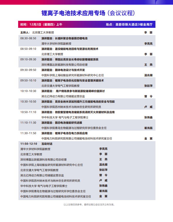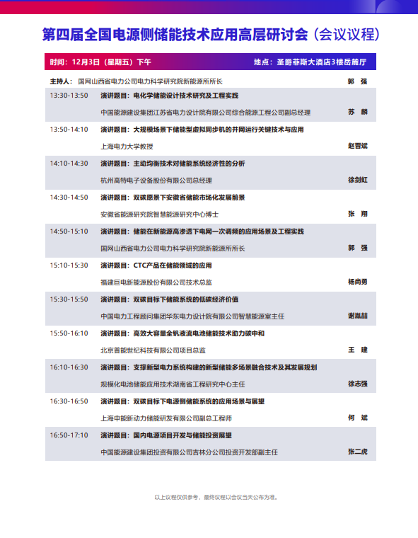 本次大會以“新儲能 新動(dòng)力 新發(fā)展”為主題,將邀請儲能領(lǐng)域?qū)<覍W(xué)者、政府主管部門領(lǐng)導(dǎo)、新能源業(yè)主單位、科研單位、發(fā)電集團(tuán)、設(shè)計(jì)院、電網(wǎng)公司、系統(tǒng)集成商以及投融資機(jī)構(gòu)企業(yè)負(fù)責(zé)人及相關(guān)產(chǎn)業(yè)代表共同參與探討和交流,為期三天的會議,主辦方將邀請130余位行業(yè)專家作主題分享,以下大會議程安排供參考,最終議程以大會當(dāng)天公布為準(zhǔn)。