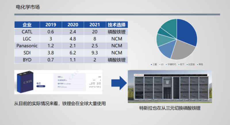 各家在鋰電池的技術(shù)路線上也分為兩派,寧德時(shí)代和比亞迪堅(jiān)定地走磷酸鐵鋰路線,而其余三家均在走三元鋰路線,特斯拉則從三元鋰切換成磷酸鐵鋰。這或與各家自身優(yōu)勢(shì)和對(duì)電儲(chǔ)能市場判斷及投入力度有關(guān)。