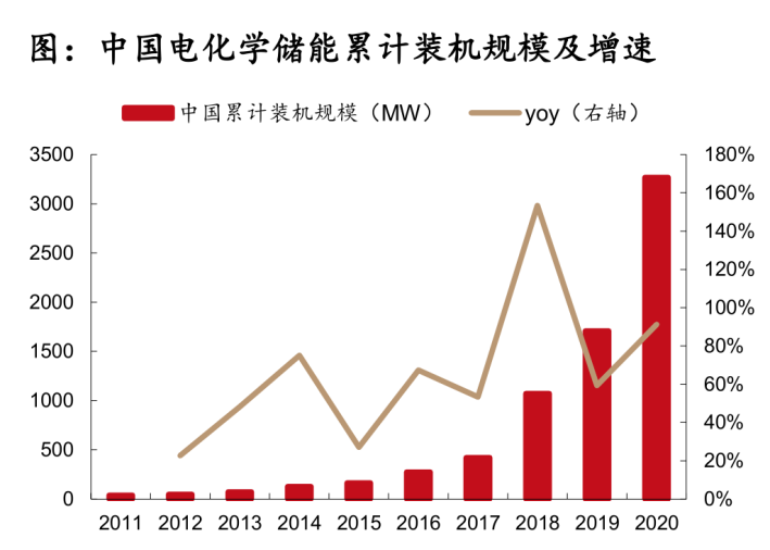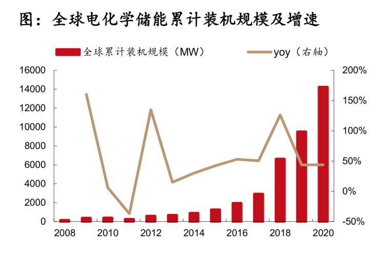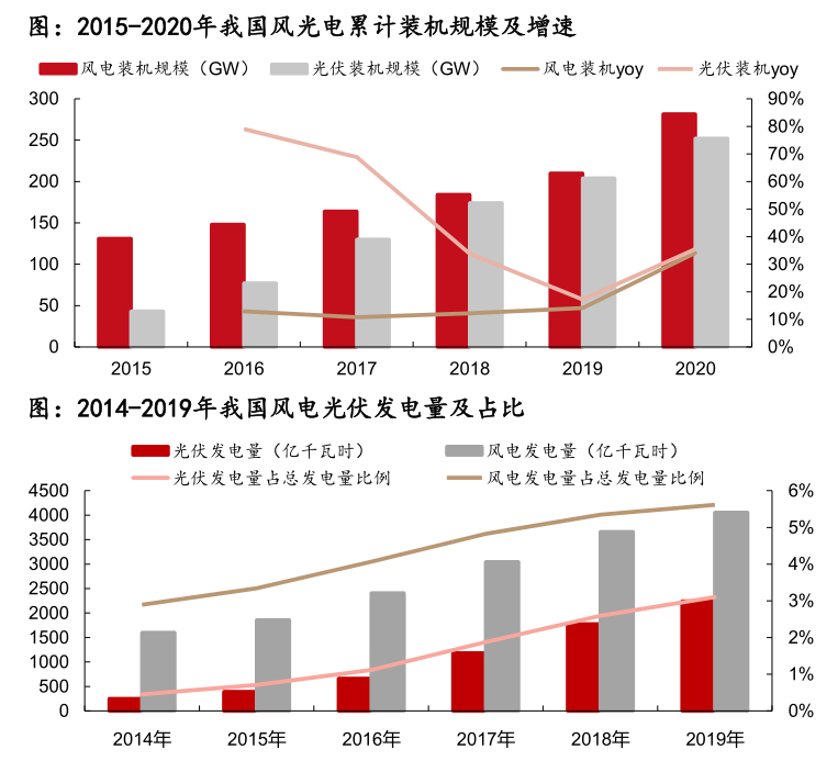 連鎖反應(yīng)之一就是,火電的替代品風(fēng)電和光伏的比重越來越高。我國2020年風(fēng)電和光伏累計(jì)裝機(jī)量已經(jīng)由2015年的131/43GW增至282/252GW,累計(jì)占比已經(jīng)超過20%,隨著風(fēng)電和光伏成本的持續(xù)下降,其占比依然在提升。而前文提到,風(fēng)電和光伏電的消納問題嚴(yán)重,為了減少浪費(fèi)和避免對(duì)電網(wǎng)的沖擊,風(fēng)電和光伏電需要電儲(chǔ)能的配套,這樣才有利于滿足電網(wǎng)規(guī)定獲取并網(wǎng)資格。